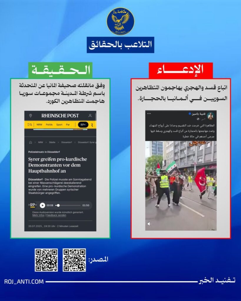الادعاء بأن أتباع “قسد” و”الهجري” هاجموا مظاهرات السوريين في ألمانيا بالحجارة ادعاء #مضلل❌ وفقاً لما نقلته الصحف الألمانية عن المتحدثة باسم شرطة المدينة فإن مجموعات سورية هي من هاجمت المتظاهرين الكورد وليس العكس.