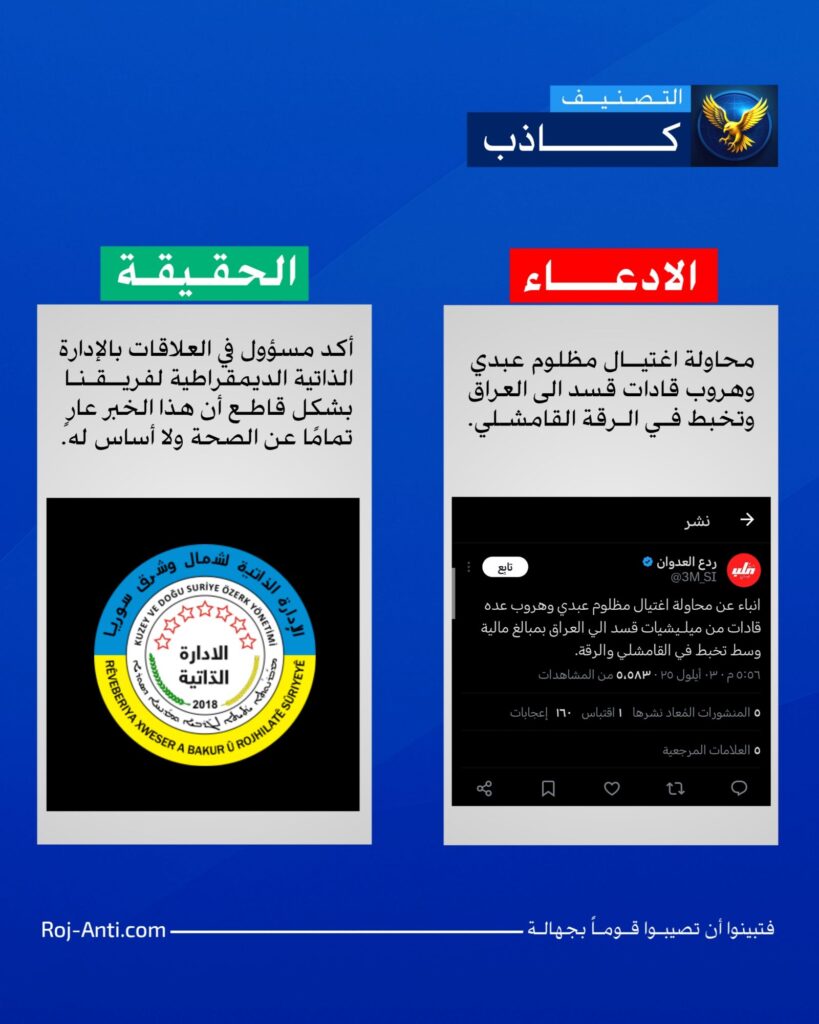 تداولت بعض الحسابات خبرًا كاذبًا حول “محاولة اغتيال الجنرال عبدي: وقد تواصل فريقنا مع مسؤول في دائرة العلاقات بالإدارة الذاتية الديمقراطية الذي أكد بشكل قاطع أن هذا الخبر عارٍ تمامًا عن الصحة ولا أساس له. ونهيب بالجميع توخّي الدقة، وعدم الانجرار وراء الشائعات المغرضة.