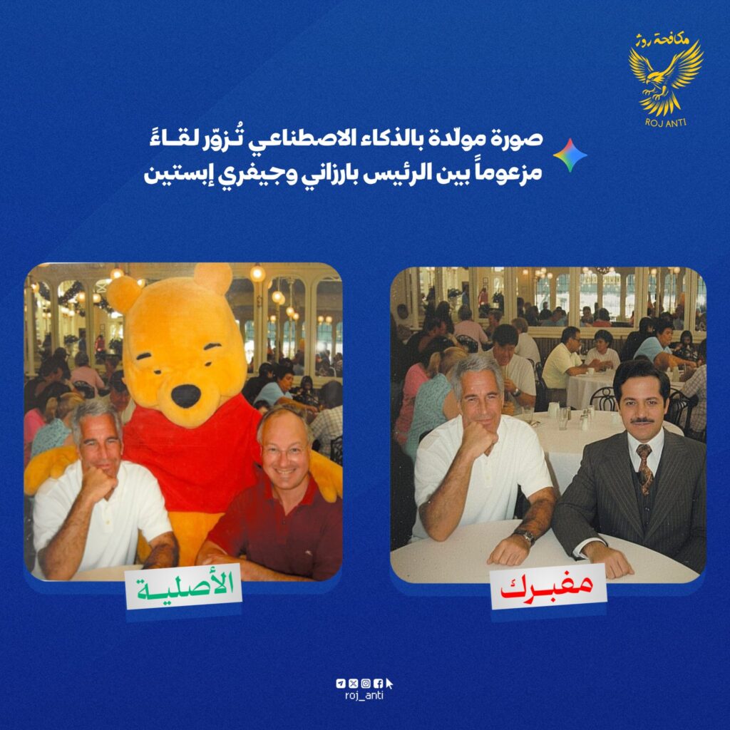 في سياق نشر معلومات مضلّلة، تتداول حسابات على مواقع التواصل صورةً مزوّرة ومولّدة بالذكاء الاصطناعي، تزعم على نحوٍ كاذب عقد لقاء بين الرئيس مسعود بارزاني وجيفري إبستين.