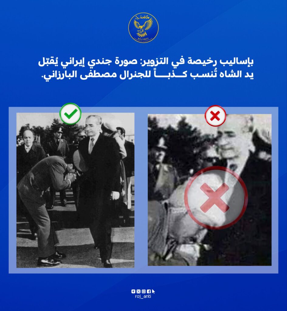 أساليب رخيصة في التزوير: صورة جندي إيراني يُقبّل يد الشاه تُنسب كذباً لمصطفى البارزاني.